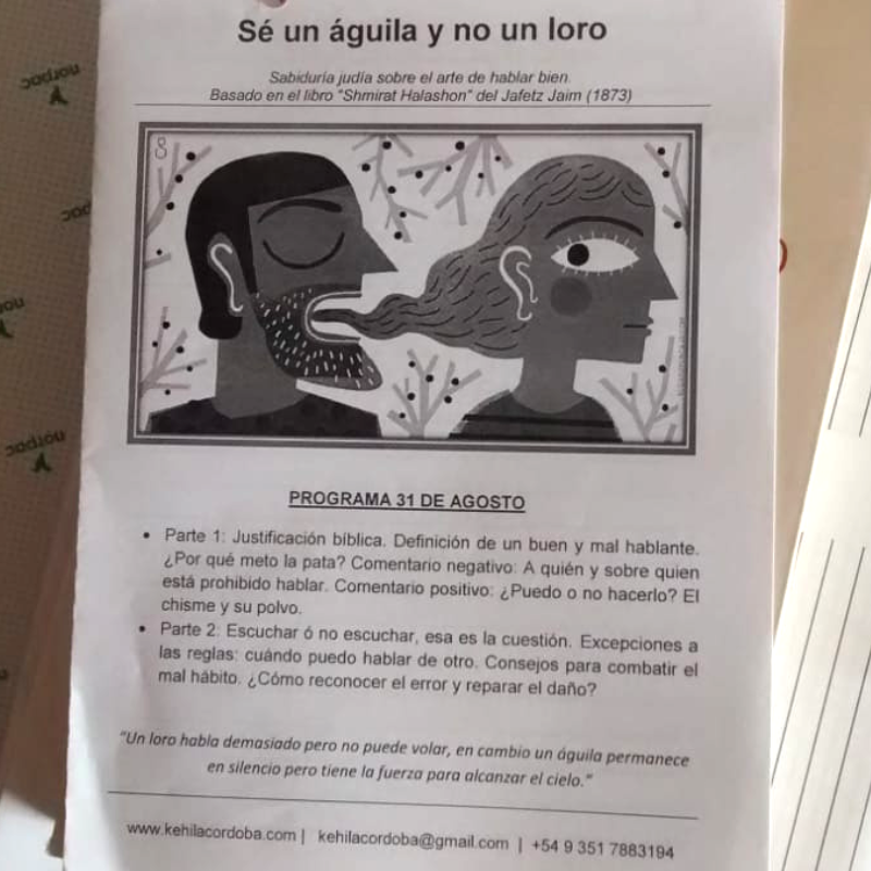 Todos los conceptos de charla estaban basados en el libro “Leyes del Cuidado del Habla” (en hebreo Shemirat HaLashon) del Jafetz Jaim, un gran rabino en Bilorusia del siglo IX.